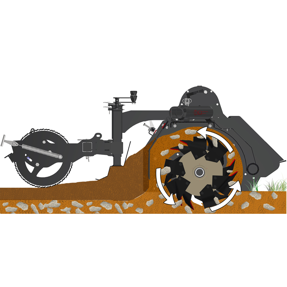 This stone burier is used in two ways. Either directly on your old ground, or on your decompacted ground and cleared of its large stones. This machine has a total width of 2130 mm (84”) and a working width of 1774 mm (69” 3/4). Thanks to its strength and power, it prepares your soil and buries detritus, grass and even rocks present on your surface. Its adjustable rear roller helps you control the working depth, which can go up to 160 mm (6” 1/4).