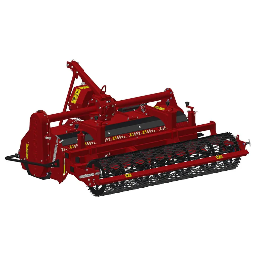 This stone burier is used in two ways. Either directly on your old ground, or on your unpacked ground. This machine has a total width of 2944 mm (116’’) and a working surface of 2492 mm (98″) wide. Thanks to its strength and power, it prepares your soil and buries detritus, grass and even rocks present on your surface. Its adjustable rear roller helps you control the depth of tilling, which can go up to 160 mm (6” ¼).