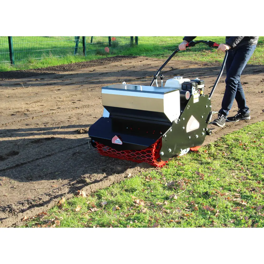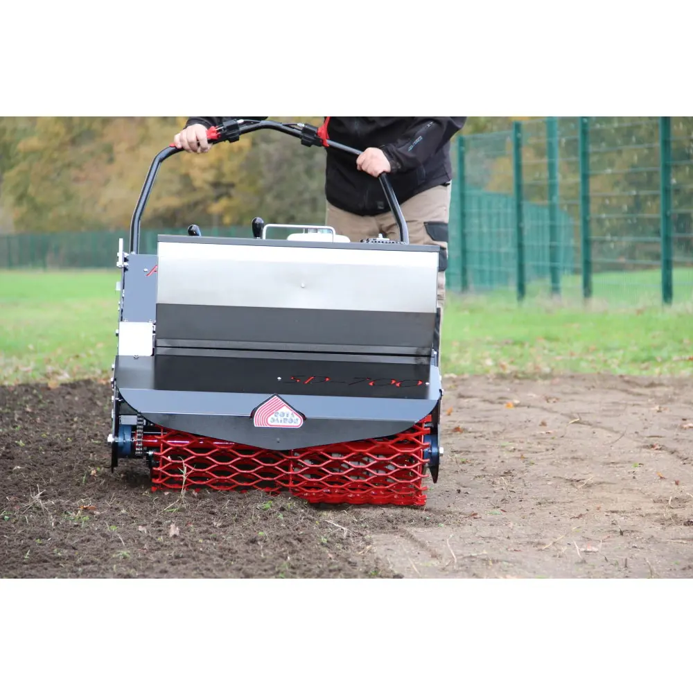 The metal mesh roller, at the front, wafts the soil. Then the seed drill deposits the seeds. Then the rotor claws the soil. Finally the smooth roller at the back compacts the soil ideally to obtain a good germination and avoid the marking of the steps of the user.