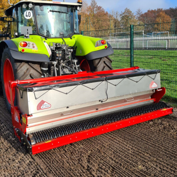 The Rotadairon® SMG 300 is equipped with a gravity stainless steel seed drill and is designed to seed large areas where the soil has been previously worked with a stone burier. This machine can be used to sow most varieties of grass such as bluegrass, faeces, ray grass, etc…