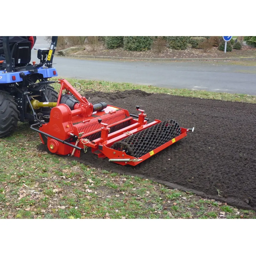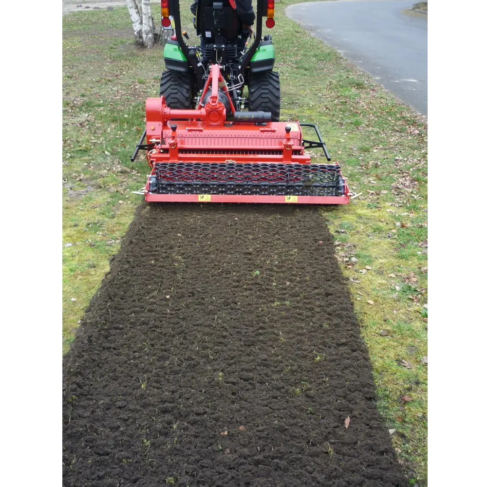 Its oversized rotor equipped with 16 patented anti-sole blades turns the ground upside down, thus burying the bulky waste from the old surface. The grid fingers retain the waste and the rocks leaving only the finest soil, which will then be levelled thanks to its height adjustable blade. Finally, its metal mesh roller allows a perfect finish of the terrain.